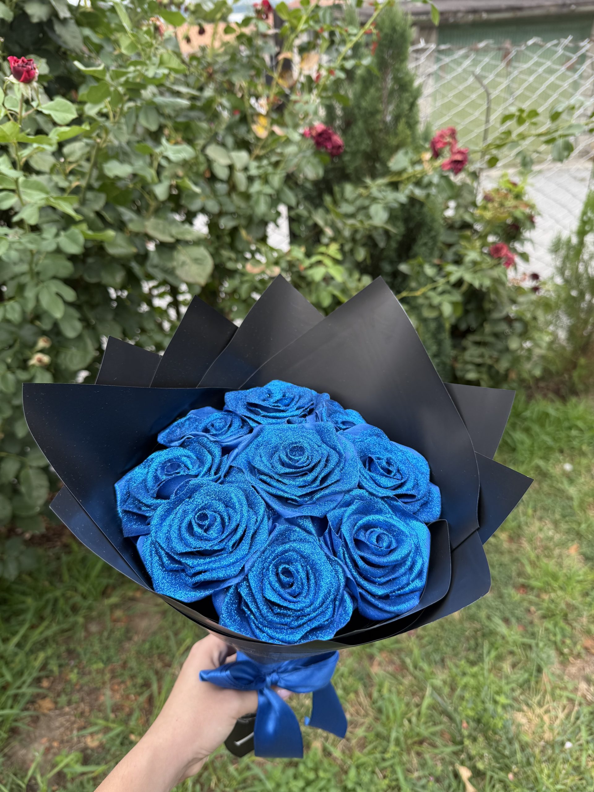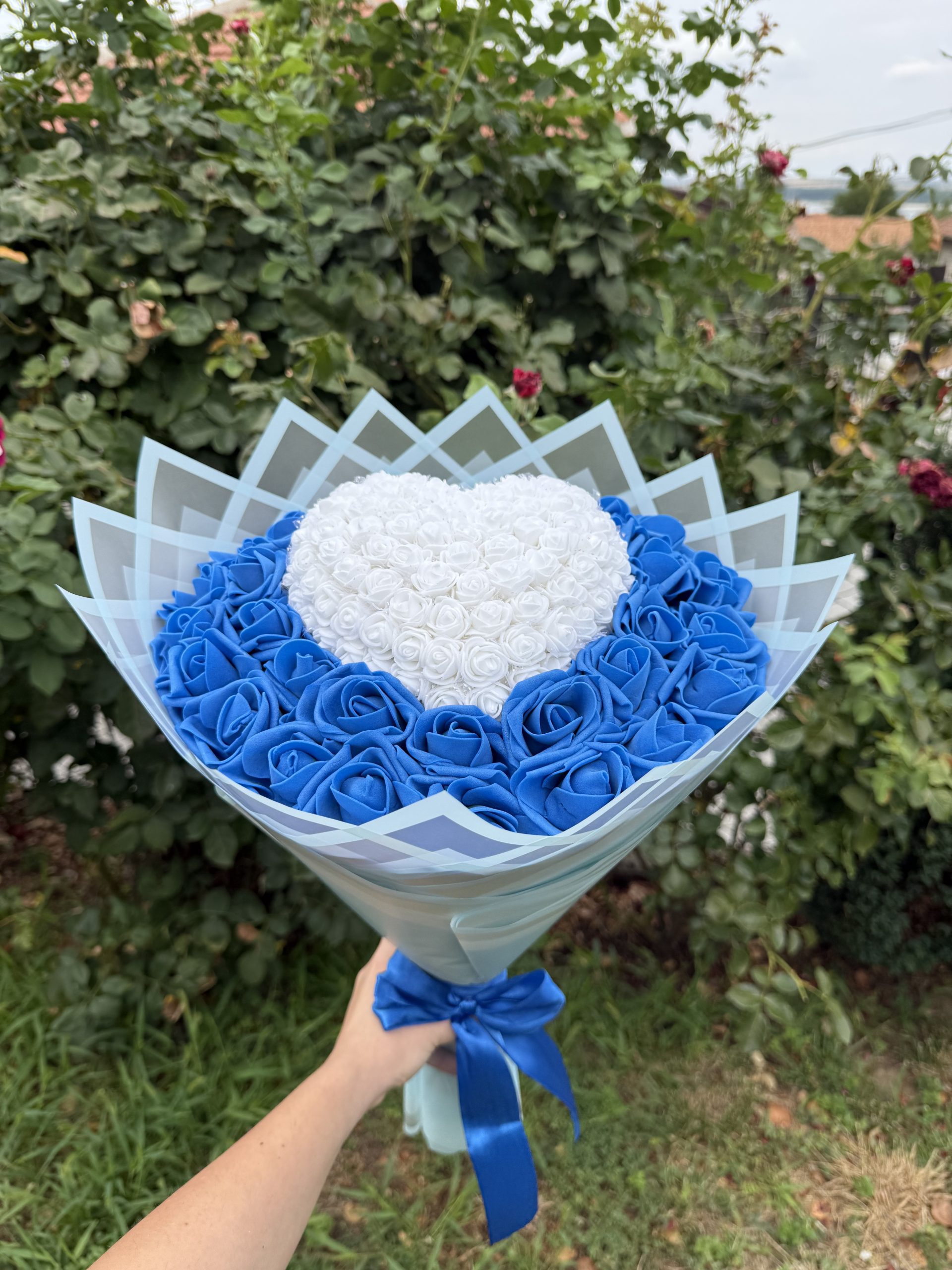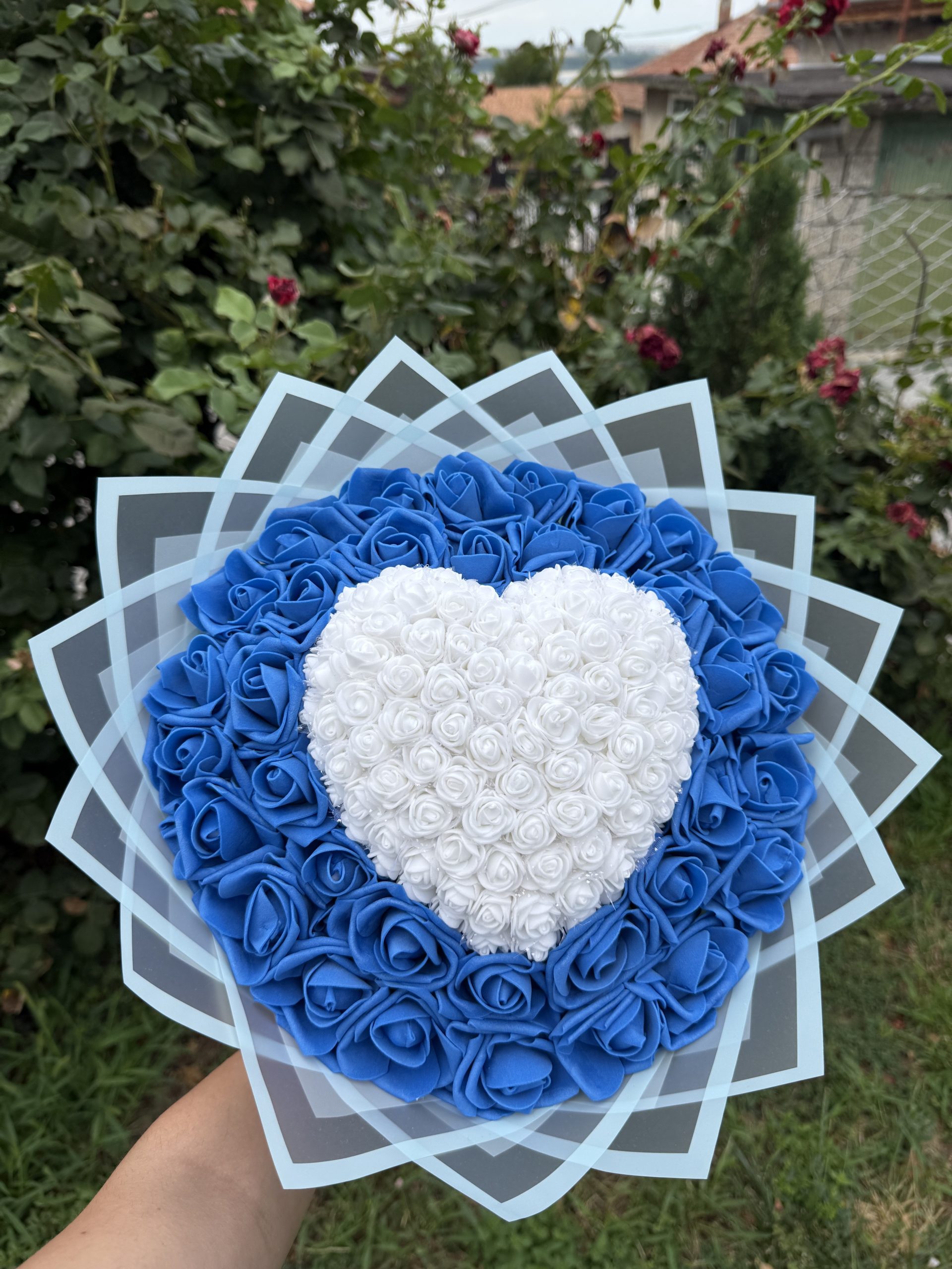 В центъра му е оформено сърце от бели рози, обгърнато от наситено сини цветове – израз на чиста любов, вярност и уважение. Уникалният дизайн и прецизната изработка го правят идеален подарък за специален повод или като жест от сърце.