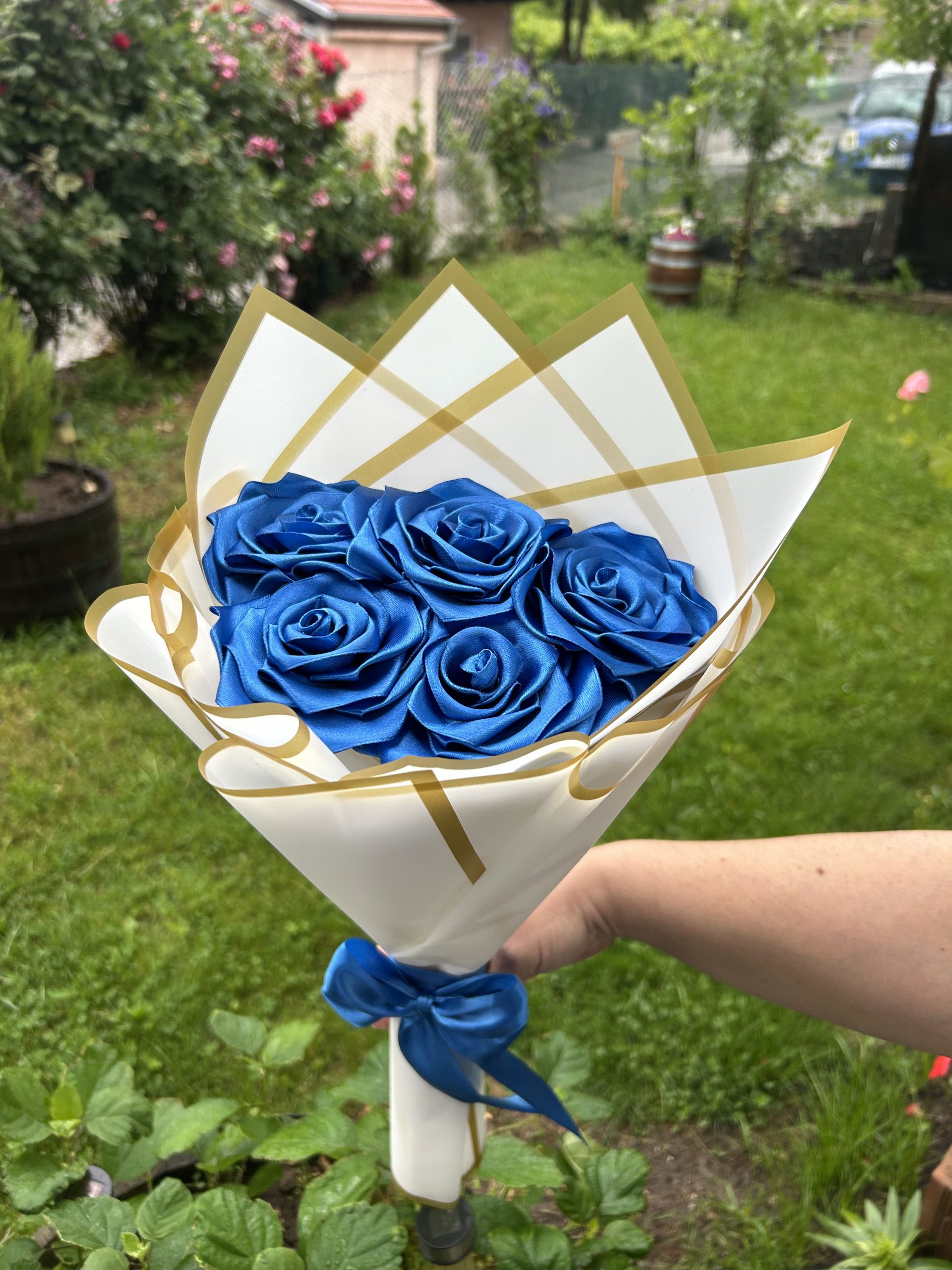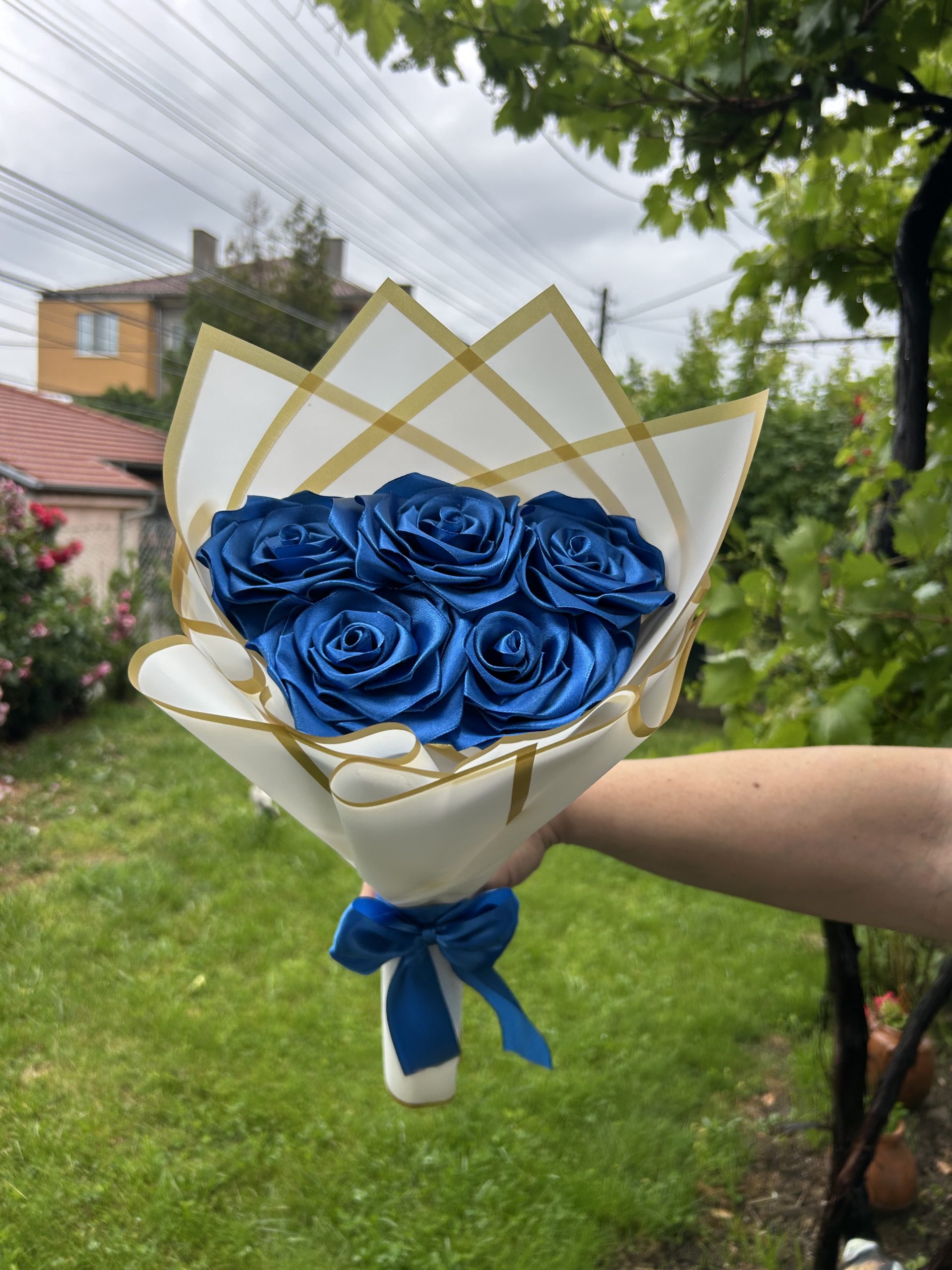Стилен и мистериозен букет от 5 тъмносини сатенени рози – символ на дълбоки чувства, вярност и изтънчен вкус.
