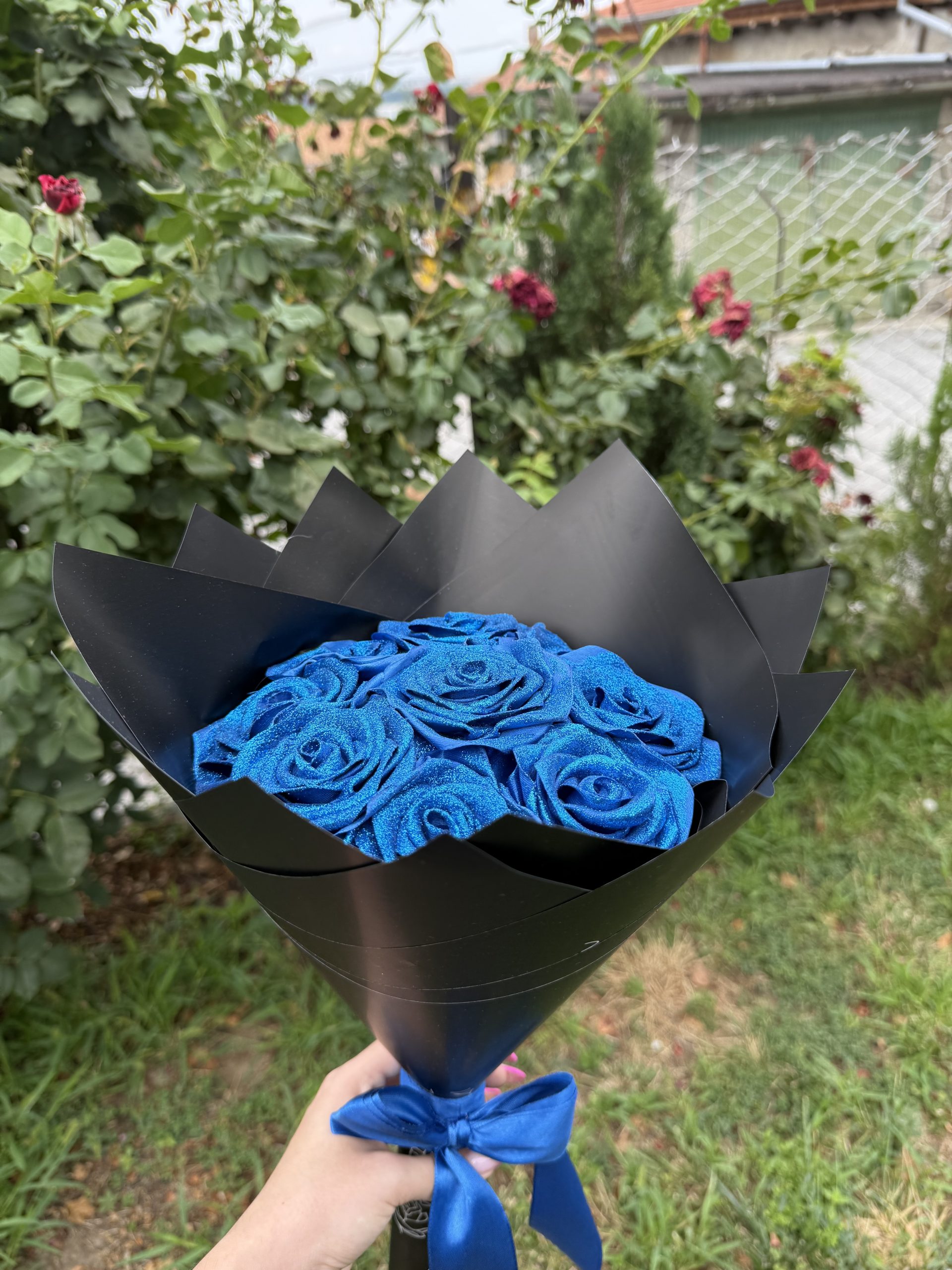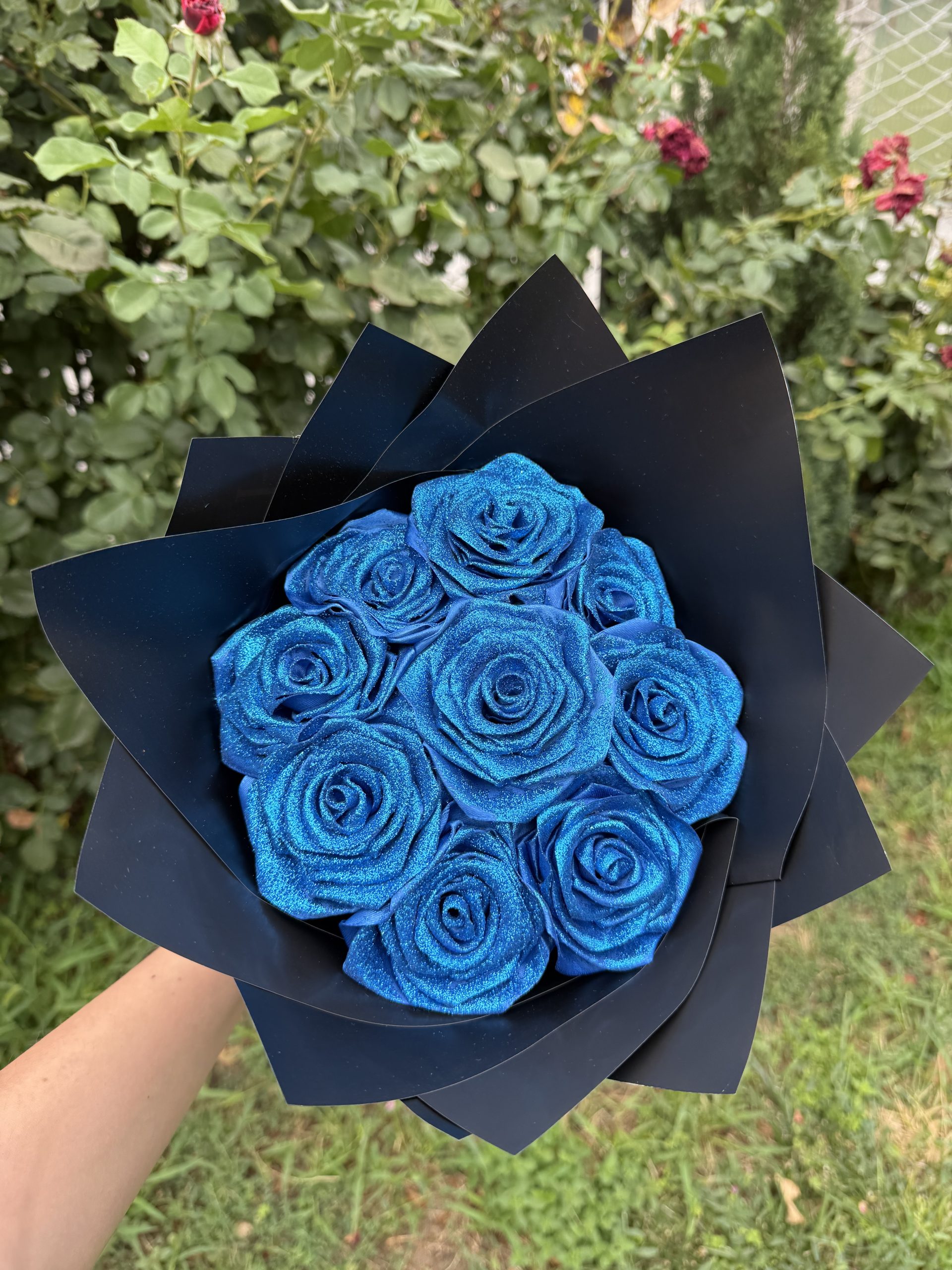 Разкошен букет от девет сатенени рози, покрити с фин брокатен блясък – изискан и стилен акцент за специален повод. Всяка роза сияе с мек отблясък, съчетавайки елегантност и лукс.