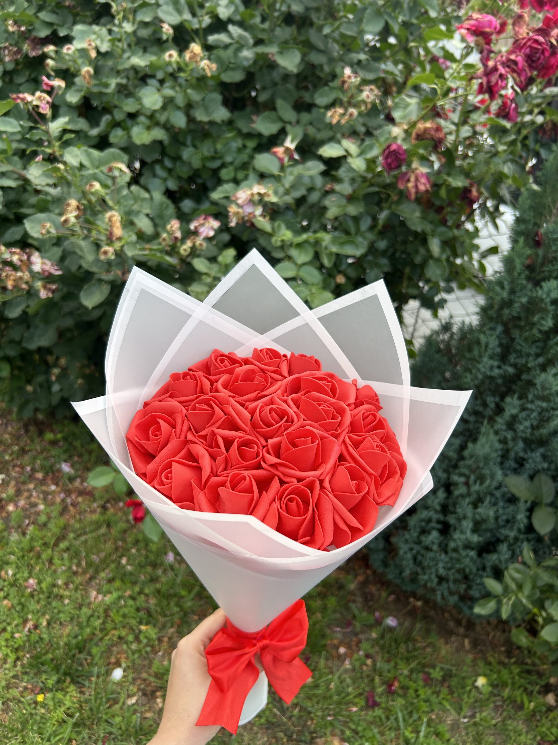 Букет от 19 фоамови рози – Елегантен и издръжлив, този ръчно изработен букет в наситено червено е перфектният подарък за всякакъв повод.